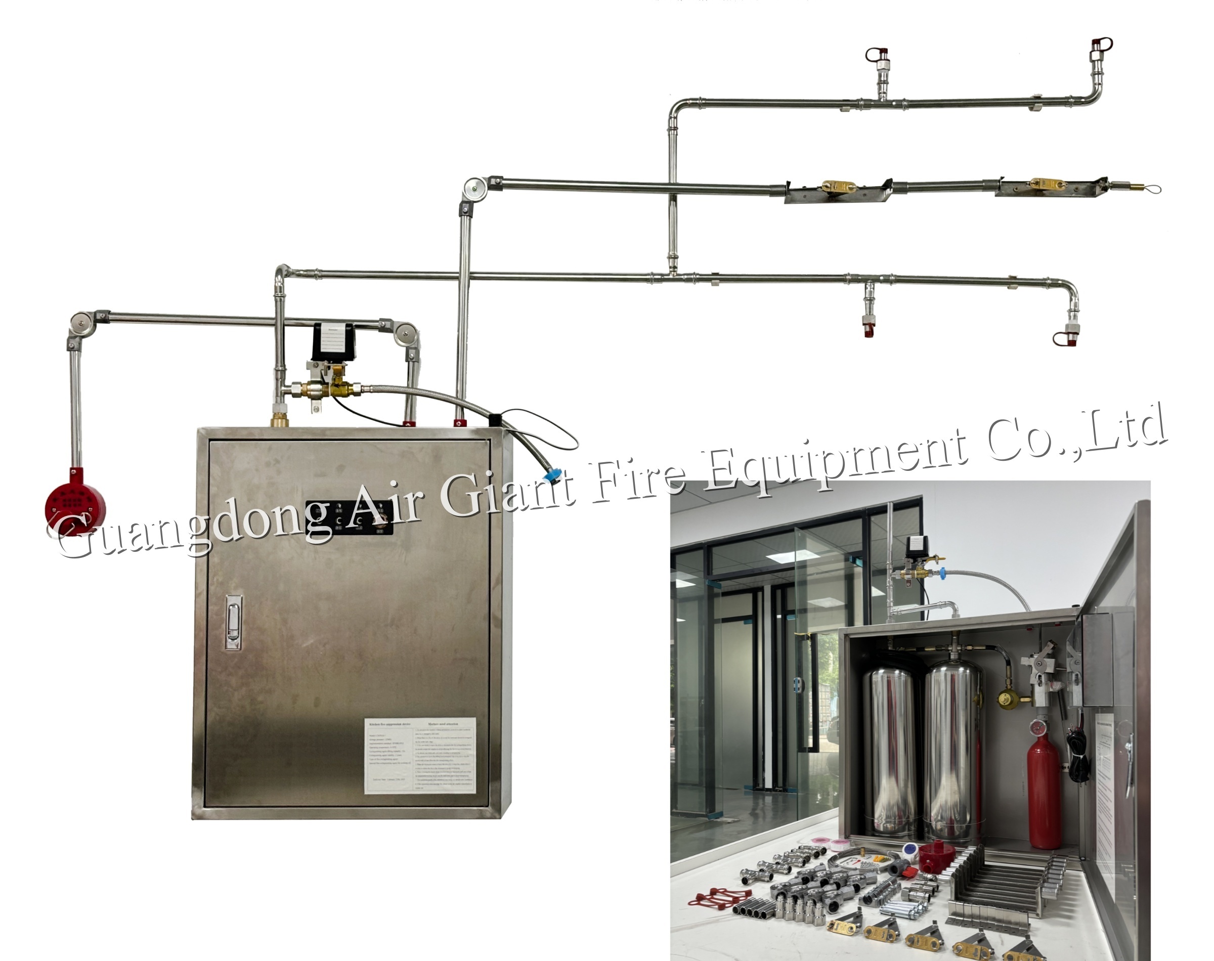 This advanced commercial kitchen fire suppression system features dual bottle configuration for enhanced protection, automatically detecting and extinguishing fires in kitchen hoods and cooking equipment.